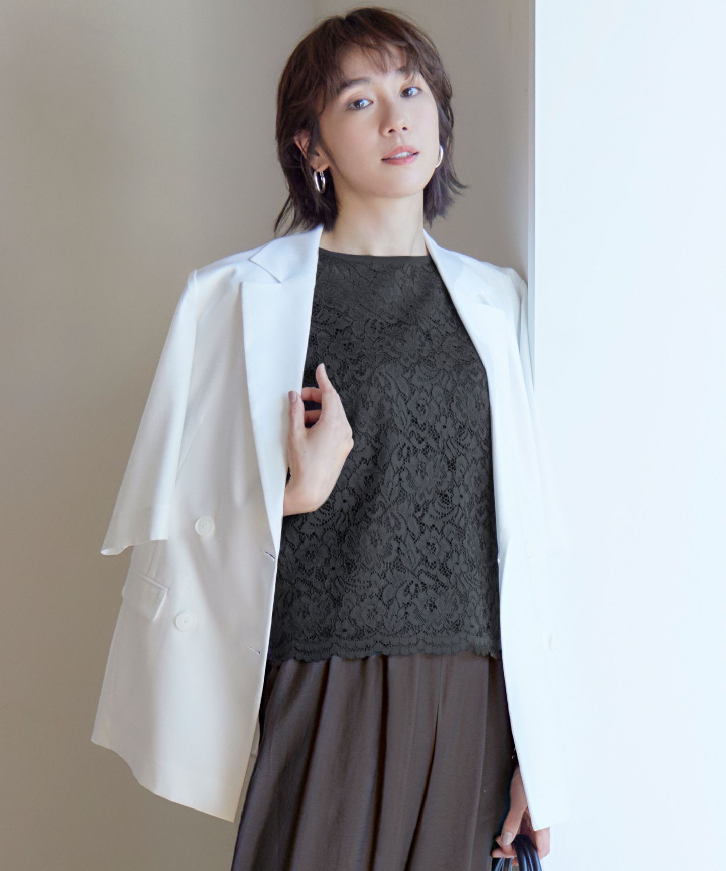 2025 Autumn羽織るだけでこなれる、洗練シアージャケット■デザイン綿ポリエステルを表側に、透明糸を裏側に合わせた天竺編みのダブルボタンのニットジャケット。程よい透け感とハリ感が特徴で、羽織るだけで洗練された印象に。前立て部分は総針編みで、襟元がきれいに返るように仕立てられています。大きすぎない身幅でありながら、前身頃の絶妙な分量感が大人っぽさを演出。冷房対策としてはもちろん、暑い夏を快適に乗り切るアイテムとしても活躍します。シワになりにくく、ご自宅で手洗い可能なイージーケアも嬉しいポイントです。きれいめパンツと合わせてオフィスシーンに、デニムと合わせてカジュアルダウンするなど、幅広いスタイリングをお楽しみいただけます。カラーは印象引き締まるブラック(#005)、抜け感を演出するベージュ(#033)、洗練された印象のネイビー(#075)の3色展開です。■素材表側には、綿にポリエステルをカバーリングし、さらに強撚加工を施すことで、ドライタッチでさらっとした風合いを実現した素材を使用。裏側は透明感と光沢があり、繊細で柔らかな手触りが特徴の素材を使用。異なる素材の組み合わせが、見た目にも涼しく、快適な着心地を叶えます。※画像はサンプルを使用している為、実際にお届けする商品と仕様が異なる場合がございます。