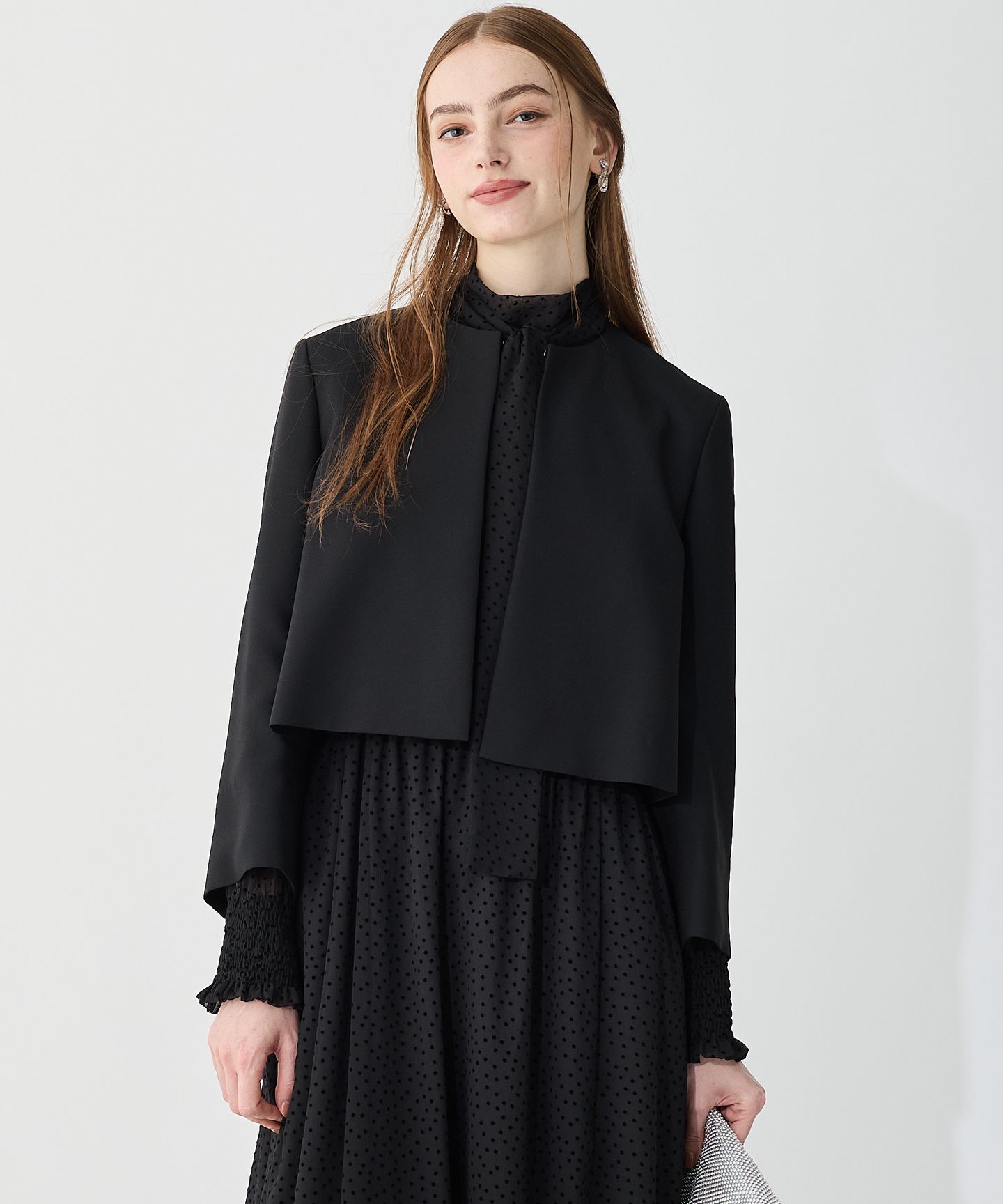 2025 AutumnAPPLAUDIR(アプロディール)APPLAUDIR(アプロディール)とは、フランス語で『喝采する・喜ぶ』という意味。結婚式やパーティなど、華やかなシーンにぴったりのAPPLAUDIR (アプロディール)シリーズをご紹介します。■デザインセンターバックにタックを入れ、ややボリュームをもたせたノーカラージャケット。ドレスと合わせてバランスのよい、広がりすぎない分量感とレングスにこだわり、体のラインを程よくカバーしながら、きちんと見えするすっきりとしたデザインです。袖口にさりげなくスリットを入れることで、袖デザインのあるドレスとも相性がよく、着心地よく仕立てています。華やかなシーンにはもちろん、お仕事、学校行事などにも着回しの効くデザインです。シックな魅力を引き立てるブラック系(#005)と清楚な雰囲気の濃いめのネイビー系(#075)の2色展開です。■素材説明柔らかな肌触りと適度な伸縮性が魅力のバックサテンジョーゼット素材を使用しています。裏面がサテンのため裏地なしでも肌触りがよく、シワになりにくいのが特徴です。ご自宅で手洗いができるのも嬉しいポイントです。※画像はサンプルを使用している為、実際にお届けする商品と仕様が異なる場合がございます。※撮影環境の都合上、実際の商品と色味が異なって見える場合がございます。商品の色味はハンガーの商品詳細画像をご参照ください。