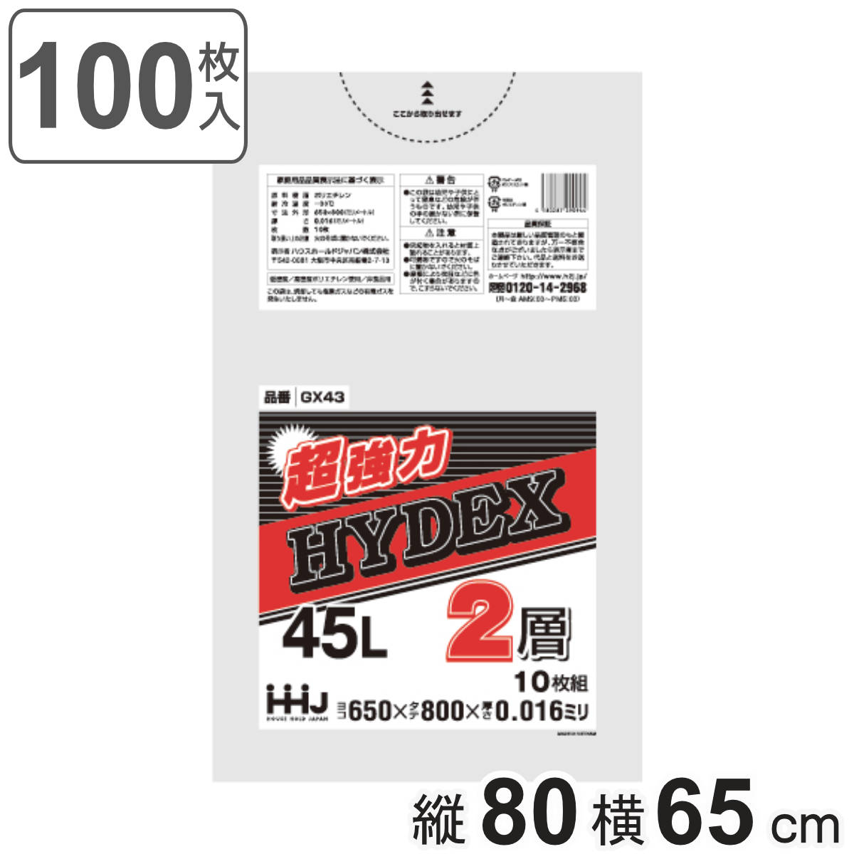 ゴミ袋 45L 80×65cm 厚さ0.016mm 10枚入 半透明 10袋セット GX43 ( ポリ袋 ごみ袋 45リットル 10枚×10 ゴミ 袋 縦80cm 横65cm ツルツル 2層タイプ )